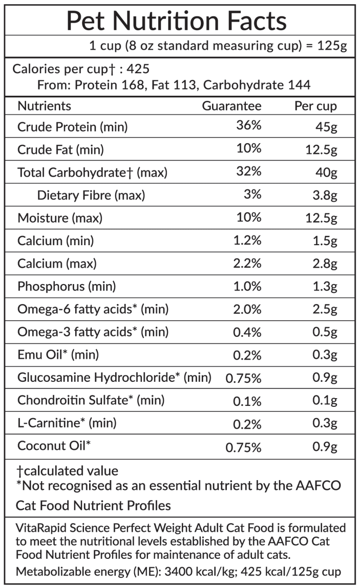 Chicken Meal (chicken (equiv. to 55%)), Barley, Brown Rice, Chicken Fat (Naturally preserved with Mixed Tocopherols), Ground Flaxseed, Glucosamine Hydrochloride, Quinoa, Coconut Oil, Dried Pumpkin, Chicory Root, Natural Flavour, Potassium Chloride, Choline Chloride, Sea Salt, Vitamins (Vitamin E Supplement, Niacin (Vitamin B3), Calcium Pantothenate (Vitamin B5), Riboflavin (Vitamin B2), Pyridoxine Hydrochloride (Vitamin B6), Thiamine Mononitrate (Vitamin B1), Folic Acid, Biotin, Vitamin A Supplement, Vitamin B12 Supplement, Sodium Ascorbyl Phosphate (source of Vitamin C), Vitamin D3 Supplement, Menadione (Vitamin K3), Minerals (Zinc Sulfate, Ferrous Sulfate, Magnesium Oxide, Copper Sulfate, Manganese Oxide, Iodine, Sodium Selenite, Zinc Propionate), L-Carnitine, Turmeric Root, Emu Oil, Chondroitin Sulfate, DL-Methionine, Taurine, Yucca Schidigera Extract, Mixed Tocopherols (a Natural preservative).